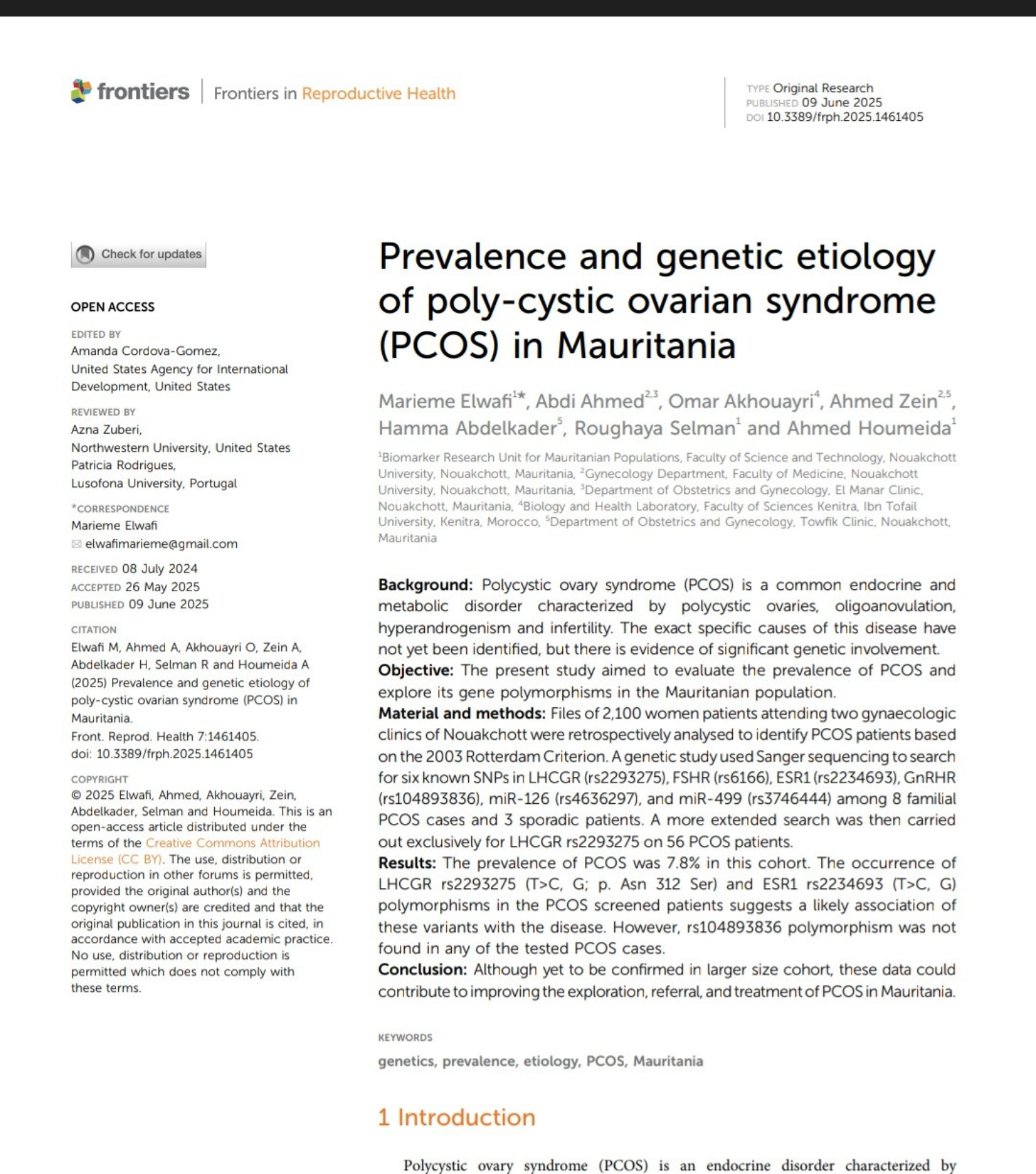En juin 2025, Marième El Wavi a publié un article intitulé : Prevalence and genetic etiology of polycystic ovarian syndrome (PCOS) in Mauritania. Frontiers | Prevalence and genetic etiology of poly-cystic ovarian syndrome (PCOS) in Mauritania Partagez votre amour Article précédent Étiologie moléculaire du syndrome des ovaires polykystiques (SOPK) Article suivant les publications scientifiques Mises à jour de la newsletter Saisissez votre adresse e-mail ci-dessous et abonnez-vous à notre newsletter S’inscrire